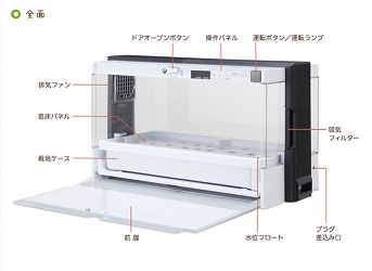 前扉がついた半密閉構成のケースだから、虫などが入り込みにくく、衛生的な栽培が可能。 ケース内に新鮮な空気を取り入れるファンを搭載し、野菜がすくすく元気に育ちます。